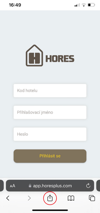 1. Otevřete Safari a zadejte https://kód_hotelu.hores.app