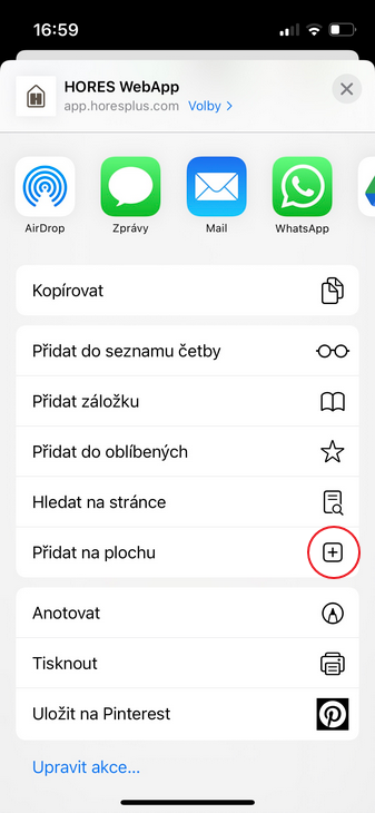 2. V ikonách zcela dole pak zvolte Sdílet a následně Přidat na plochu.
